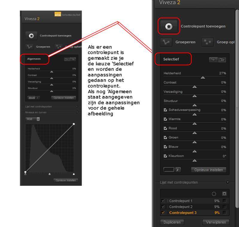 De Viveza 2-module is een eenvoudige maar krachtige tool die controlepunten gebruikt om de kleuren en tonaliteit (helderheid en contrast) van uw afbeeldingen globaal en lokaal te herwerken. Met controlepunten kunt u kleuren accentueren of verzwakken door te spelen op de tinten, verzadiging en helderheid, en kunt u zowel het contrast als het microcontrast van uw afbeeldingen herwerken